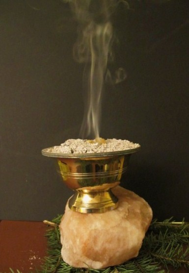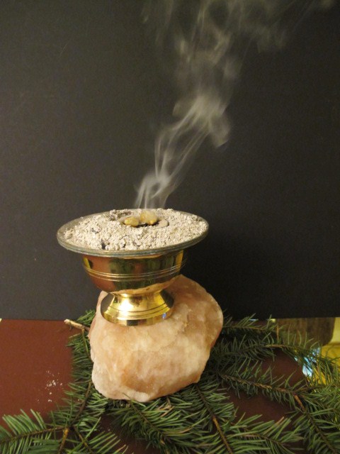 Entweder lege ich auf ein Stövchen ein dünnes Kupferblech (Aluminium sollte vermieden werden), darauf kommt dann der Weihrauch, der sich jetzt herrlich mit Kräutern aus dem Garten mischen lässt, z.B. Salbei, Pfefferminze, Lavendel, Thymian, Beifuß u.v.a. (mehr Informationen zu diesen Räucherritualen, die in Deutschland vor 80 bis 100 Jahren noch weit verbreitet waren, findet man bei Marlis Bader, Räuchern mit heimischen Kräutern, ISBN -10:3-466-34466-2). Wer Weihrauch "nicht riechen kann", sollte auf diese Art einmal eine Weihrauch-Lavendel-Mischung auf dem Stövchen versuchen. Die desinfizierende Wirkung des Weihrauchs wird sehr gut verstärkt, wenn ihm Salbeiblätter aus dem Garten - frisch oder getrocknet- auf dem Kupferblech beifügt werden. Ein beginnender Schnupfen ist damit schnell vertrieben.