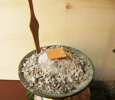 Oder ich entzünde eine Räucherkohle in einem Räuchergefäß, das mit Sand oder Asche gefüllt ist. Sobald die Kohle durchgeglüht ist, wird sie mit feiner Asche bedeckt. Die Asche wird dabei ähnlich einer Pyramide leicht mit einem Holz- oder Metalllöffel auf der Kohle festgedrückt. In Japan werden mit dieser Methode feinste Räucherzeremonien durch geführt und edelstes Adlerholz verräuchert. In die Pyramide sticht man mit einem dünnen Metallstift (eine geöffnete Büroklammer geht auch) ein bis zur Kohle. Auf diesen Kamin legt man ein kleines, sehr dünnes Kupferblättchen (2,5 x 2,5 cm).
